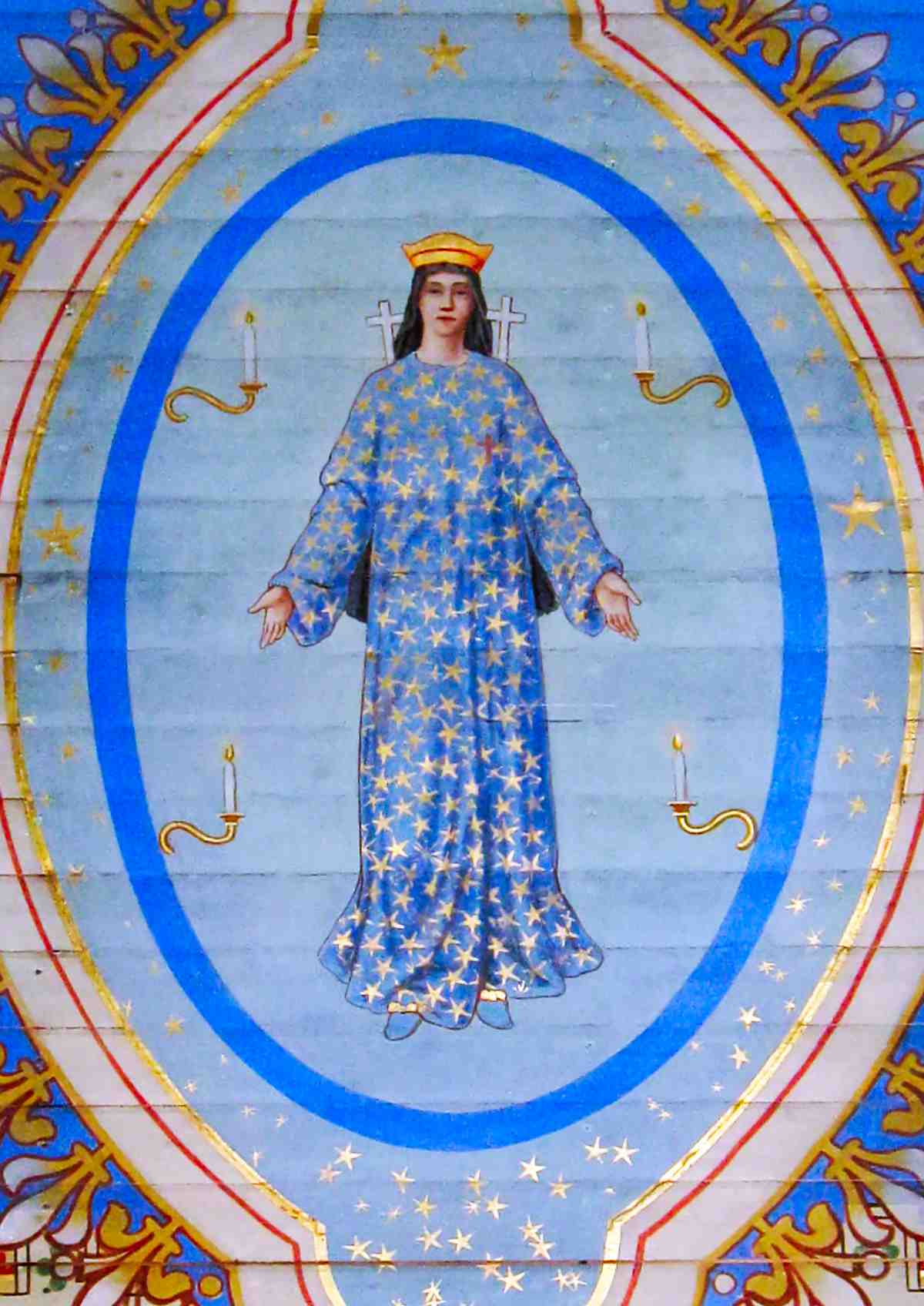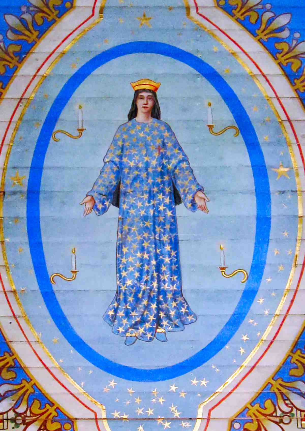 Die Jungfrau Maria steht im Zentrum von 3 großen Sternen: ein klarer Hinweis auf die göttliche Dreifaltigkeit, deren Botschafterin Sie ist.