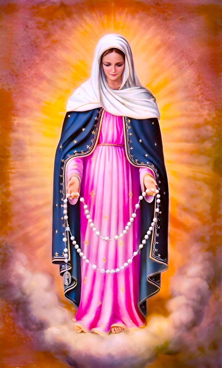 「なぜ私が青いマントを着ているか知っていますか?あなたが労働の疲れから休息するとき、そして試練の十字架を背負っているときに天国のことを思い出させるためです。私のマントは天国のことを思い起こさせてくれます。それは言い表せない喜びと永遠の幸福を与え、あなたの魂には勇気を、心には平和をもたらし、最後まで戦う力をつけてくれます!」
